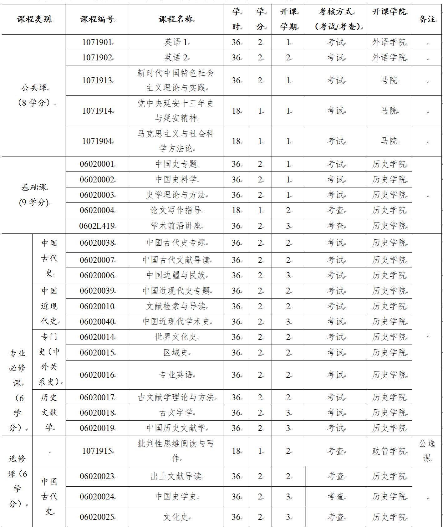 中国史专业研究生必须完成 1 项与本学科相关的研究工作,具体形式可为参与科研课题研究、古籍整理、撰写研究报告、决策咨询报告、社会调研等,各学科可根据实际情况作出具体要求,由指导教师进行考核,考核合格后获得 1 个学分。