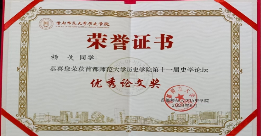 1、2023年6月由21级硕士研究生杨戈撰写的论文《汉魏六朝史评中的汉桓帝形象》获首都师范大学williamhill英国官网第十一届史学论坛优秀论文奖